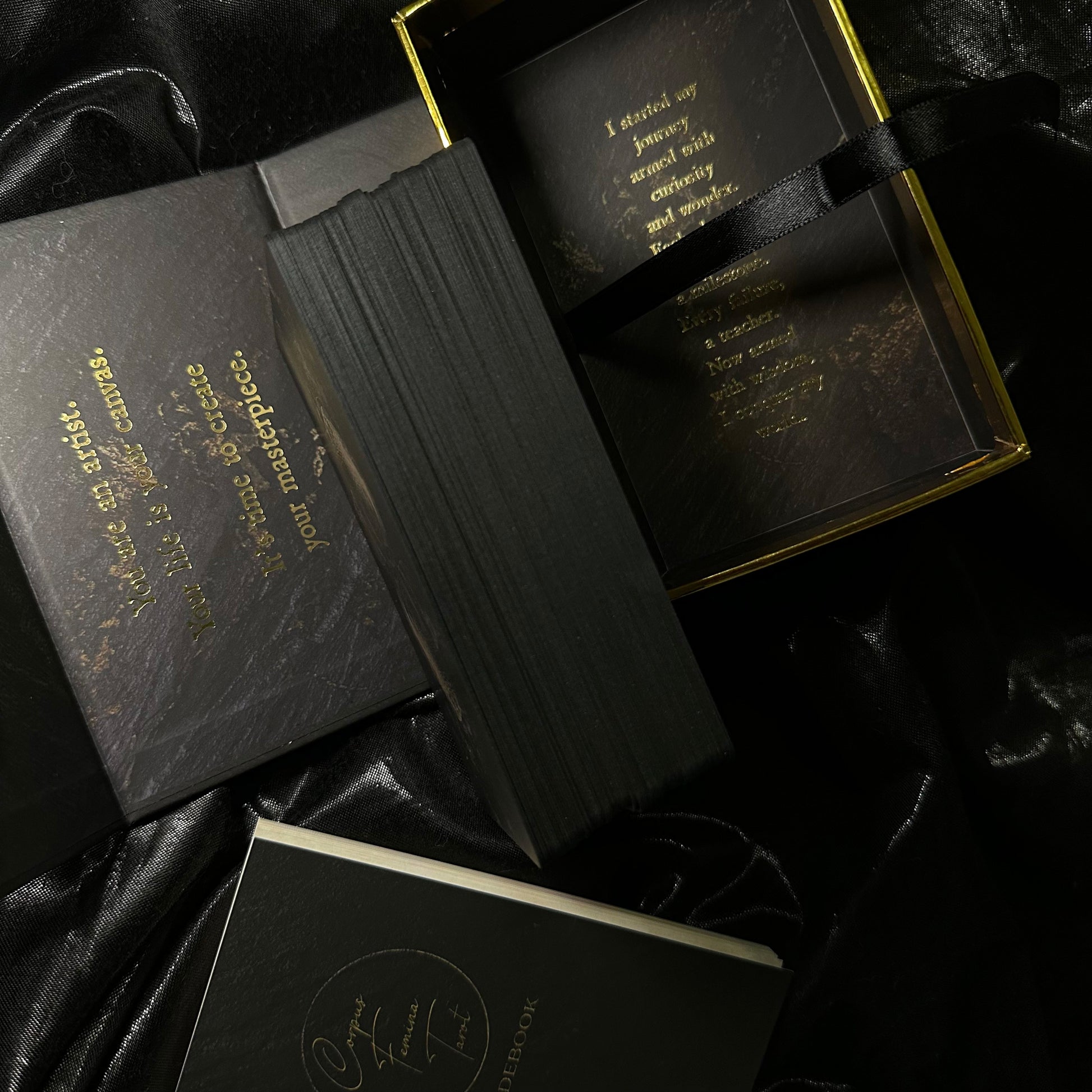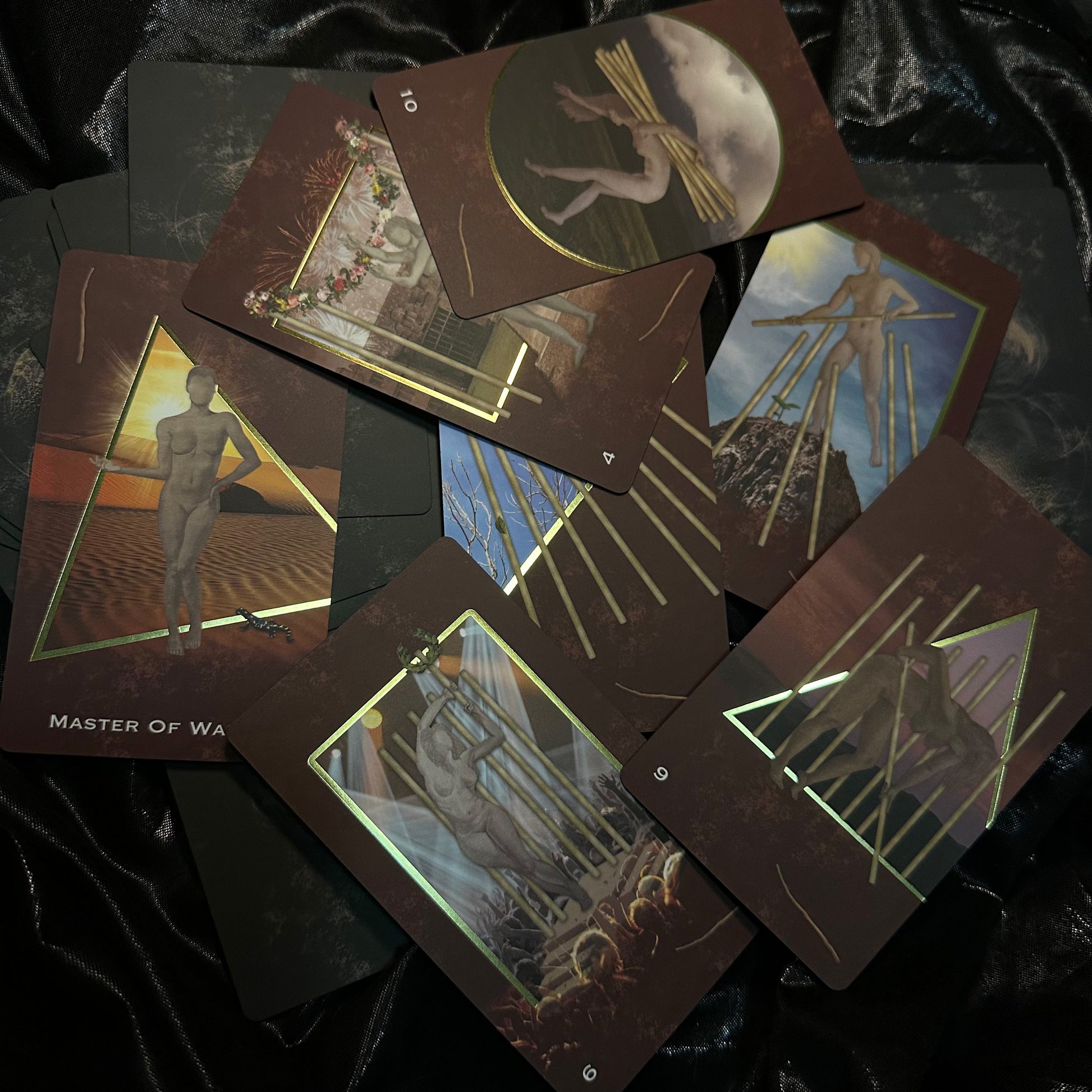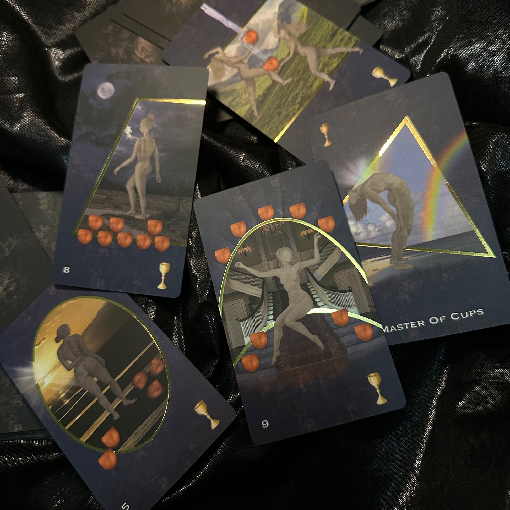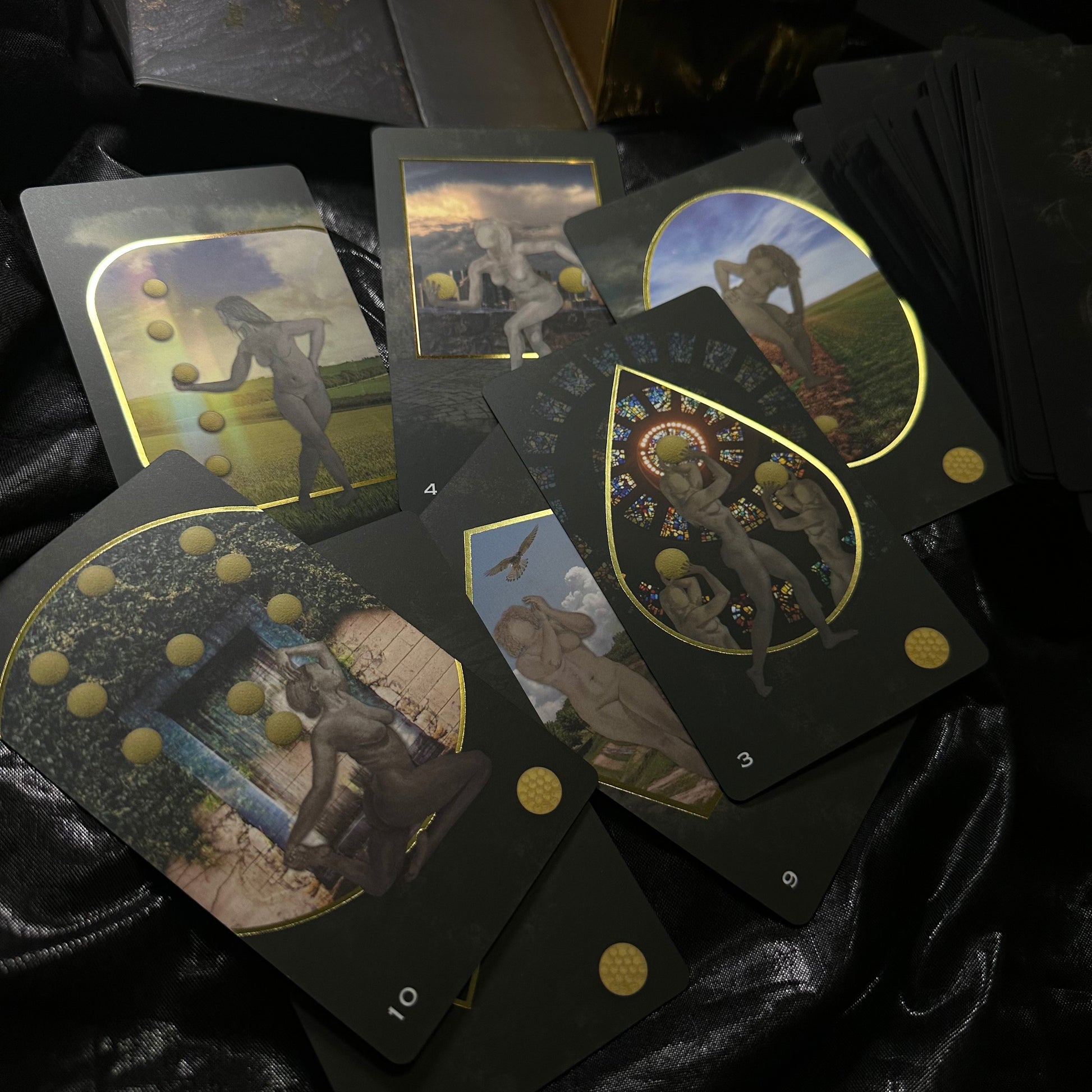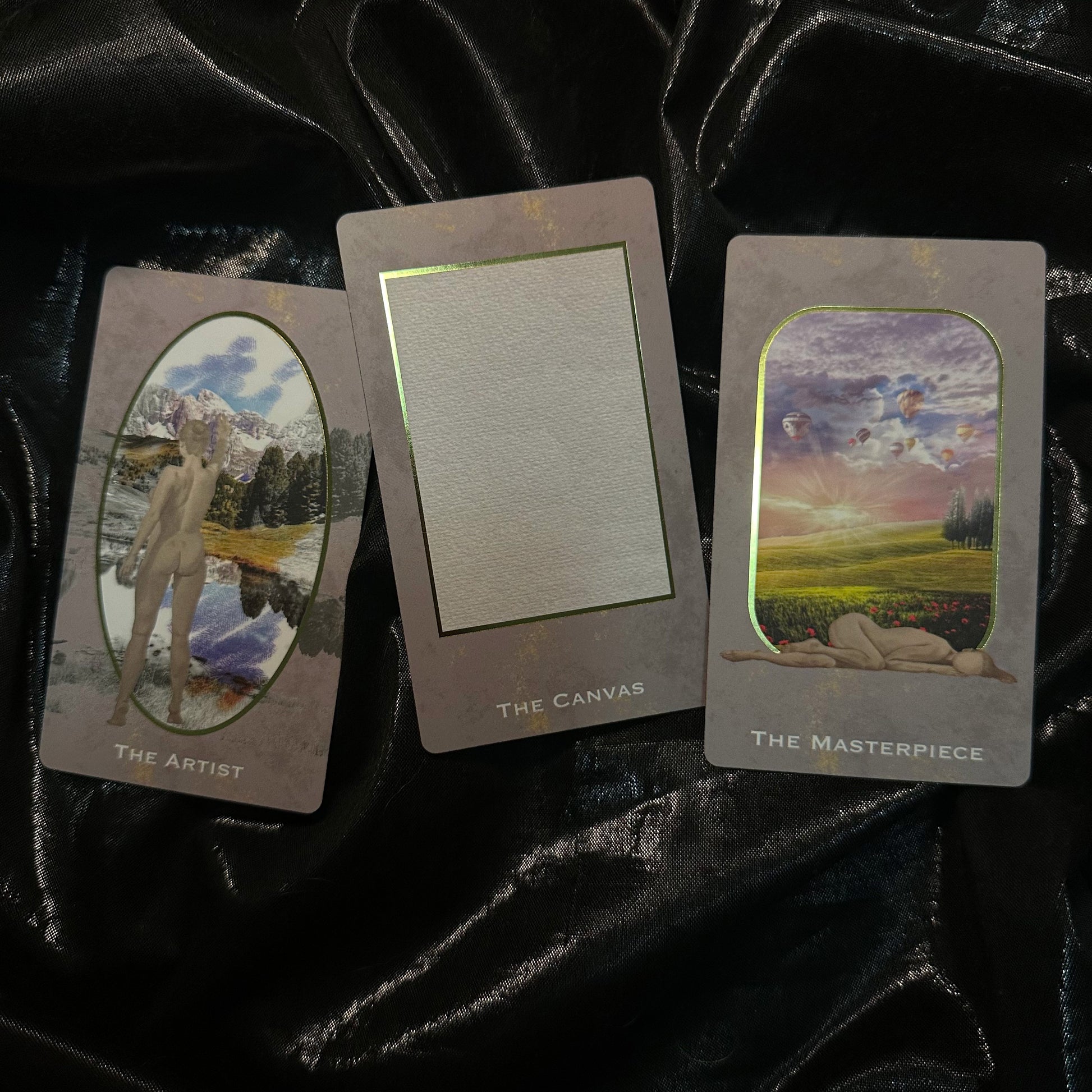 This tarot deck showcases a fusion of traditional and modern art. The naked female figures were drawn with graphite pencil on a regular sketchbook. This drawing was then added to a digital collage created using photo editing/graphic design software. It is a marriage of old and new unique to this deck.